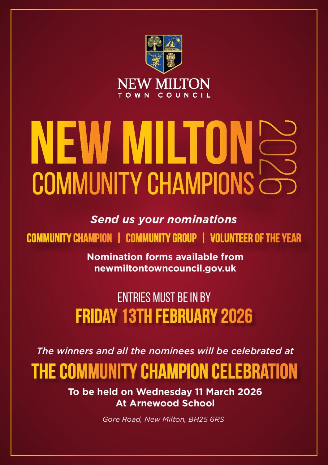 - The winners will be announced at our Civic Celebration on Wednesday 11 March 2026 at Arnewood School where awards will be presented.